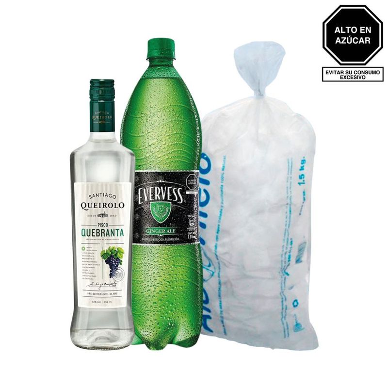 Combo Pisco QUEIROLO Quebranta Botella 750ml + EVERVESS Botella 1.5L + Hielo Alo Bolsa 1.5 kg